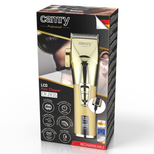 Masina De Tuns Si Aparat De Ras, Camry, CR2835G, Multifunctional, Profesionala, Afisaj LCD, 100 W, 2 Viteze, Pentru Acumulator, Ceramic/Titan, Auriu