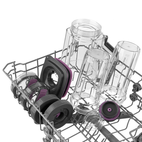 Recipientele sunt perfect potrivite pentru amestecarea in vid. In cutia blenderului, vei gasi un vas principal de amestecare de 1,5 litri si doua sticle de 0,7 litri cu capac de inchidere practic, astfel incat sa le poti lua cu tine peste tot.