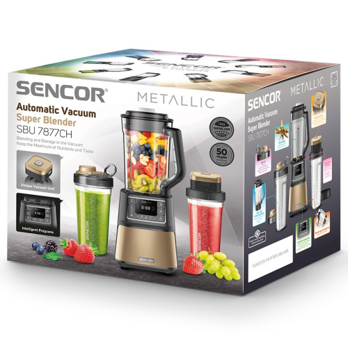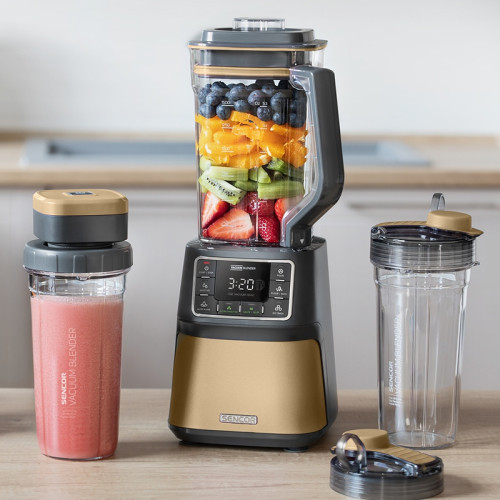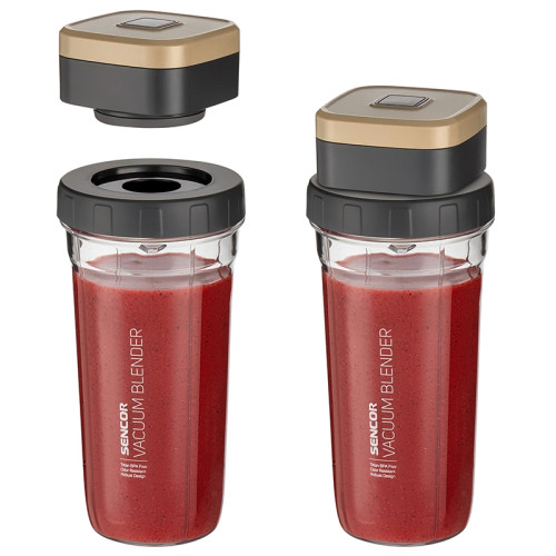 Continut pachet: 1,5 l Tritan (PCTG) vas de amestecare, 0,7 l recipient de depozitare pentru bauturi proaspete (smoothie), unitate de vid