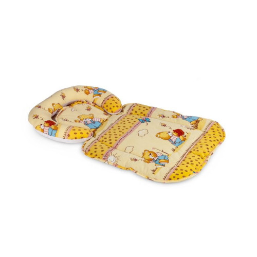 Tetiera are margini inalte, cu rol de protectie a capului bebelusului si se prinde usor de paturica prin intermediul unui snur.