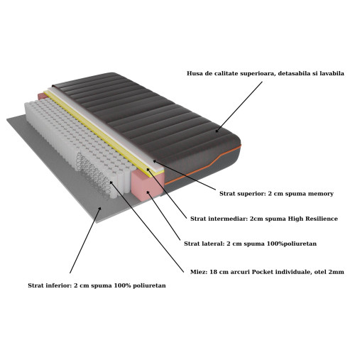 - 2 cm High Resilience Foam de densitate 30 kg/mc, pentru elasticitate și adaptabilitate.