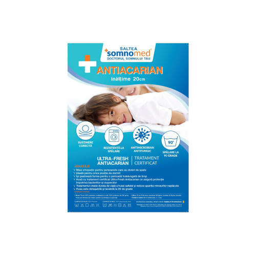 Somnomed Antiacaria este o saltea proiectată pentru a oferi un somn confortabil și sănătos, cu protecție specială împotriva acarienilor. Husa tratată antiacarieni și nucleul de spumă High Resilience oferă un echilibru perfect între suport, durabilitate și igienă, fiind ideală pentru persoanele alergice sau sensibile.