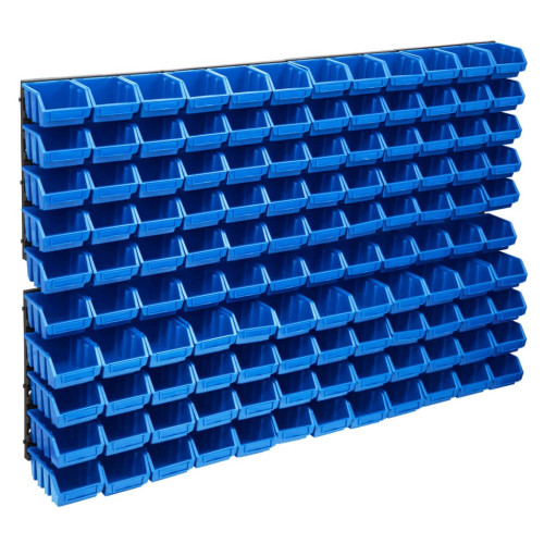Raftul funcțional cu cutii stivuibile oferă multe posibilități de depozitare pentru articole mici precum șuruburi, cuie, piulițe, mufe, fitinguri etc. Cele 8 panouri de perete solide conțin 120 de cutii, care pot fi etichetate, pentru o mai bună perspectivă asupra tuturor pieselor mici. Puteți scoate coșurile de depozitare individual și le puteți stivui unul peste altul. Setul este extensibil și ușor de montat pe peretele unui garaj sau al unei barăci. Acest set cu coșuri de depozitare poate fi configurat pentru a se potrivi tuturor nevoilor dvs.