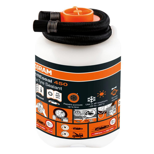 Osram TYREseal 450 este un material de etansare pentru anvelope care poate fi utilizat ca inlocuitor pentru setul original de produse de etansare pentru anvelope. OSRAM TYREseal 450 va permite sa sigilati punctiile de pana la 6 mm, utilizand cea mai recenta tehnologie de gel de particule si apoi sa va umflati din nou anvelopa cu un compresor de anvelope, cum ar fi Osram TYREinflate 200, 450 sau 1000. Sigilarea unei anvelope deteriorate se poate face Rapid si usor, fara scule sau cricuri, astfel incat sa va puteti relua calatoria in decurs de 10 minute. Lungime: 90 mm Latime: 90 mm Inaltime: 190 mm